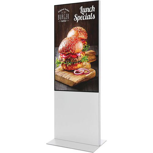 Chevalet à écran Digital Totem Samsung. Totem publicitaire numérique s adaptant parfaitement a l écran. Design sans cadre élégant et moderne. Base lourde en acier de 8 mm assurant une bonne stabilité, également fixable au sol.
