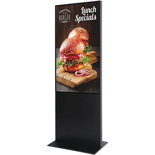Chevalet à écran Digital Totem Samsung. Totem publicitaire numérique s adaptant parfaitement a l écran. Design sans cadre élégant et moderne. Base lourde en acier de 8 mm assurant une bonne stabilité, également fixable au sol.