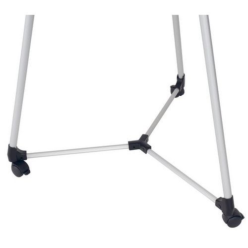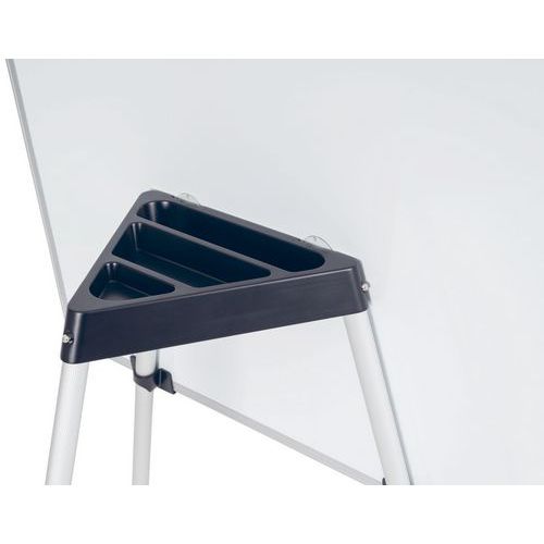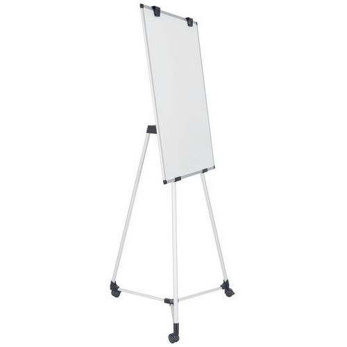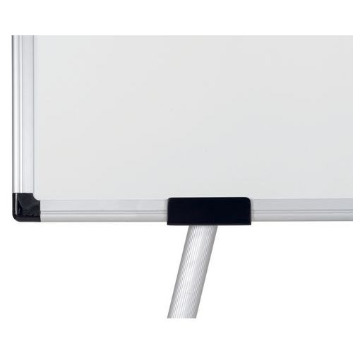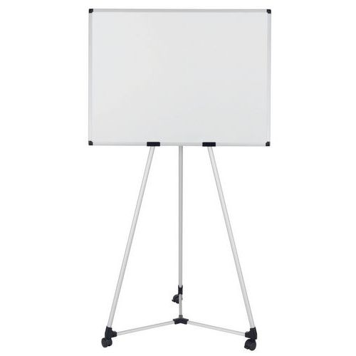 Tableau blanc magnétique 100x70cm, trois pieds en aluminium, base centrale en plastique qui sert également d'auget pour ranger les accessoires, crochets pour blocs de papier, kit mobile, notice de montage.