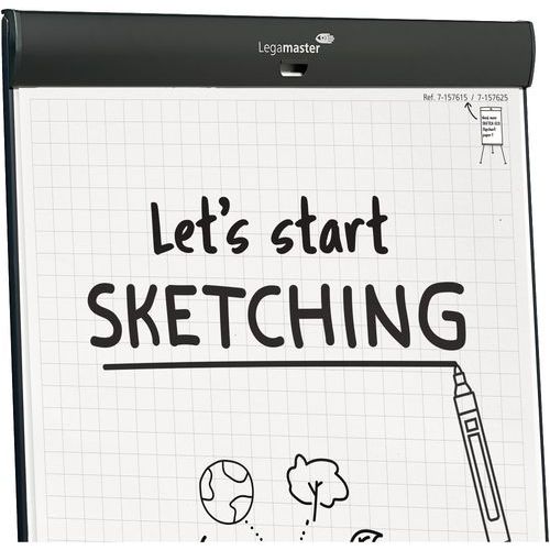 1 Legamaster Sketch Pro chevalet de conférence mobile base ronde, 1 Legamaster Sketch Eco bloc-papier quadrillé 1x 20 feuilles, 2 Edding 31 Eco Line Marqueur pour chevalets noir, 1 porte-marqueurs, 2 bras latéral extensible.