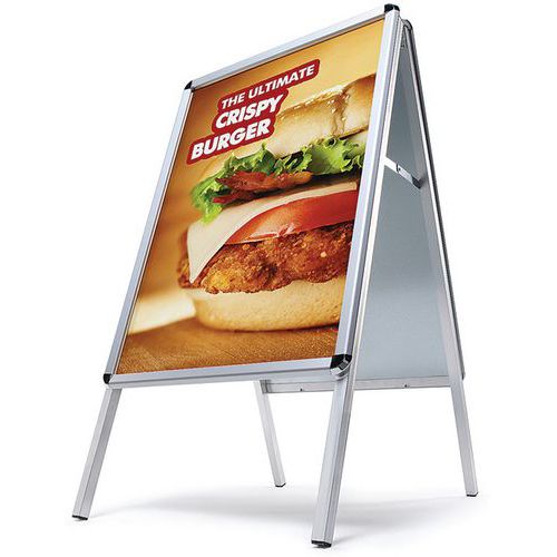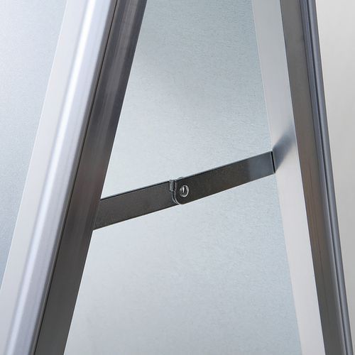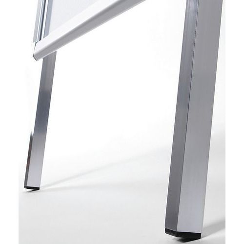 Chevalet Stop trottoir avec cadre en aluminium, excellent moyen de communication et visibilité. Design attrayant mais aussi stable grâce aux inserts en plastique dans les pieds en aluminium. Chevalet résistant aux chocs avec dos en métal inoxydable. Protection des affiches avec feuilles antireflet résistantes aux UV. Facile à déplacer grâce à la forme de chevalet pliant.