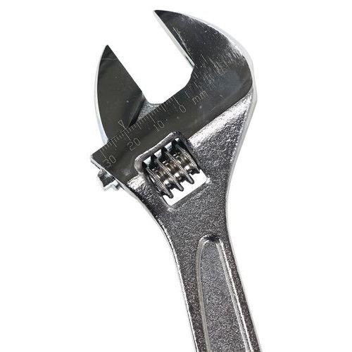 Clé à molette en acier chrome vanadium avec tête fine inclinée à 15°, crémaillère du mors non débordante. Serrage universel des écrous hors normes ou endommagés. Tête finition brillante.