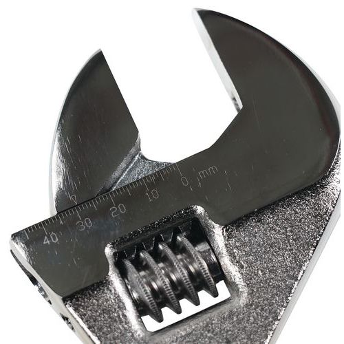 Clé à molette en acier chrome vanadium avec tête fine inclinée à 15°, crémaillère du mors non débordante. Serrage universel des écrous hors normes ou endommagés. Tête finition brillante.