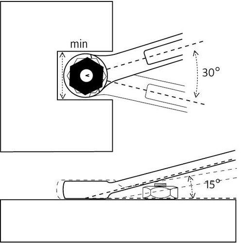 Œil 12 pans profil OGV® pour une puissance et une longévité accrue. Clé polygonale avec reprise à 30°. Finesse de tête pour une meilleure accessibilité. Le profil OGV réduit les contraintes grâce aux larges surfaces de contact et à la suppression des angles vifs dans l'outil. L'entraînement est effectué par les faces de l'écrou : les angles ne sont plus sollicités, la longévité de la clé est accrue.