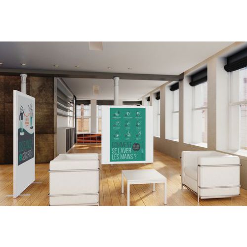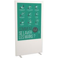 Cloison d’information avec impression rappel des gestes barrières. Stable avec structure cadre et pieds acier finition laquée blanc. Panneau toile double face, lavable machine, tissu classé M1. Cloison de séparation de montage et d’entretien aisés.