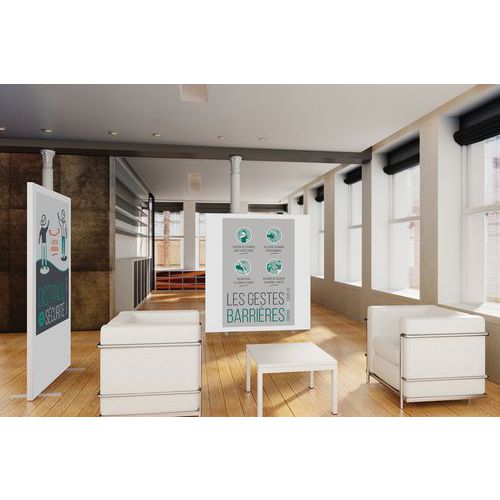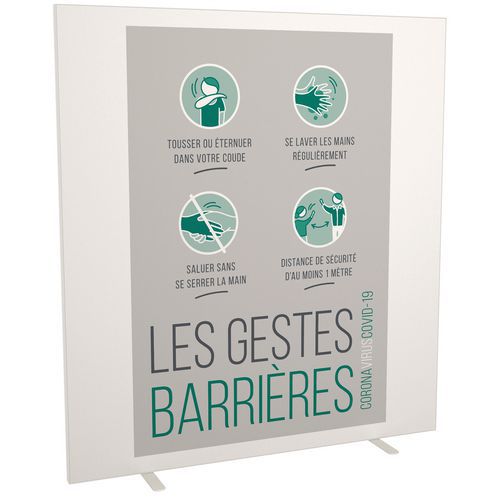 Cloison d’information avec impression rappel des gestes barrières. Stable avec structure cadre et pieds acier finition laquée blanc. Panneau toile double face, lavable machine, tissu classé M1. Cloison de séparation de montage et d’entretien aisés.