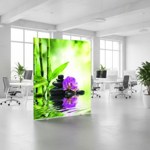 Panneau en toile classé au feu M1, démontable et lavable à 30° Equipée de 2 pieds en acier laqué blanc Montage facile et rapide de la toile Poids 9,5 kg Panneau en toile classé au feu M1 Fabriqué en UE Garantie client : 10 ans Service installation/montage : Option montage