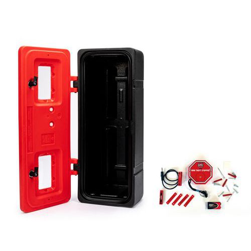 | Intitulé du produit | Coffre extincteur, Matériau: Polyéthylène, Coloris: Rouge/noir, Pour extincteur poids: 6 kg |