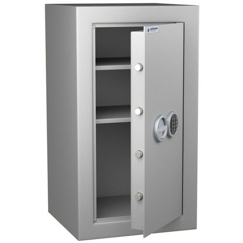 Coffre-fort série Vulcain de 40 à 205 litres. Protection Anti-effraction Norme Allemande VDMA niveau B. Blindage anti-perçage au manganèse du systéme de condamnation. Tablette réglable en hauteur. Livraison sur rendez-vous avec mise en place chez le client avec reprise des emballages pour recyclage. Rez-de-chaussée avec 2 marches maximum ou étage avec ascenseur. Maximum 20 mètres de roulage. Pour toutes demandes particulières de livraison, veuillez contacter notre Service Clients (accès difficiles, forte pente, terrain meuble).