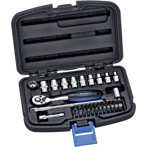 Composition : 10 douilles 1/4" : 4 - 5 - 6 - 7 - 8 - 9 - 10 - 11 - 12 - 13 mm , 1 cliquet rond 36 dents 1/4" , 2 rallonges 50 et 150 mm , 1 adaptateur 1/4" x 1/4" , 24 embouts 30 mm