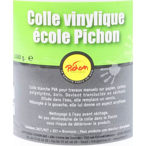 | Intitulé du produit | Colle vinylique école 1Kg, Conditionnement: Flacon, Contenance: 1 kg, Coloris: Blanc, Sans COV: oui |