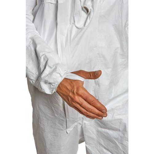 Elastique aux poignets, aux chevilles, à la taille et au visage. Passe-pouces en matériau Tyvek®. Fermeture à glissière et rabat en matériau Tyvek®.