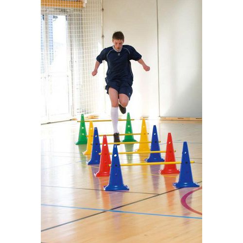 Construisez des parcours sportifs ! L'insertion de jalons dans les trous des cônes permettent de réaliser des haies de tailles différentes. L'ajout d'un cerceau plat coincé dans la fente au sommet du plot sont des cibles idéales pour l'entrainement des tirs au foot par exemple.