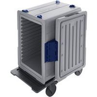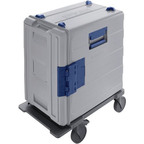 Conteneur de transport de repas en polypropylène, roulant, avec roues conformes DIN 18867-8 en matière plastique, 4 roues pivotantes, dont 2 avec frein, avec porte battante, pivotant à 270°