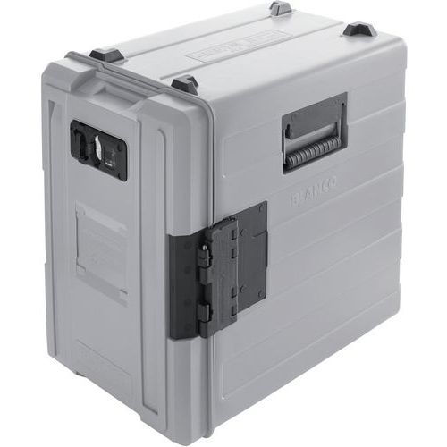 Conteneur de transport de repas en polypropylène, chauffé par air pulsé, avec régulateur de température numérique pour la régulation au degré près de la température dans l’espace intérieur entre +40 °C et +85 °C, avec porte battante