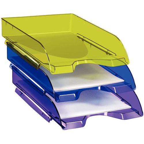 Superposable verticalement ou en escalier. Larges renforts latéraux. Corbeille ou bannette avec rebords inclinés. Capacité 450 feuilles. Accepte documents jusqu'au 24 x 32 cm.