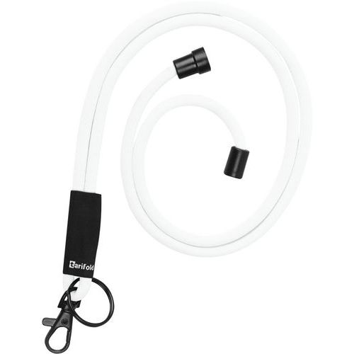 - Lanière tour de cou textile avec fermeture de sécurité et accessoires noirs.