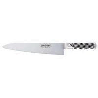 Couteaux série G. Couteaux à grande lame et manche rond creux assurant équilibre et prise en main optimum. Héritiers de la grande tradition des samouraïs japonais, les couteaux GLOBAL sont la référence dans le domaine de la gastronomie. Les lames en acier inoxydable CROMOVA 18 garantissent un tranchant remarquable. Leur design exceptionnel offre un parfait équilibre en main. La gamme proposée est large, chaque forme est spécialement adaptée à un usage particulier. Chaque couteau est livré dans une boîte individuelle avec oeillet de suspension. Entretien : Laver à l’eau chaude et essuyer. Ne pas laver au lave-vaisselle. Ne pas utiliser de produits chlorés qui détériorent l’acier spécial de la lame. La longueur indiquée est celle des lames.