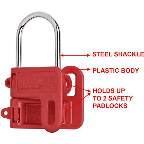 Le moraillon en acier Master Lock nº S430 présente une mâchoire interne d'un diamètre de 57 mm x 76 mm x 25 mm pouvant accueillir jusqu'à deux cadenas.