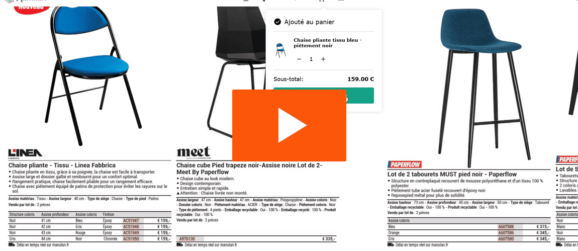 Cliquez sur une référence pour l’ajouter au panier du catalogue et ensuite le partager ou l’imprimer. Vous pouvez aussi convertir le panier du catalogue en panier d’achat sur le site web pour bénéficier des mises à jours (délais et prix).