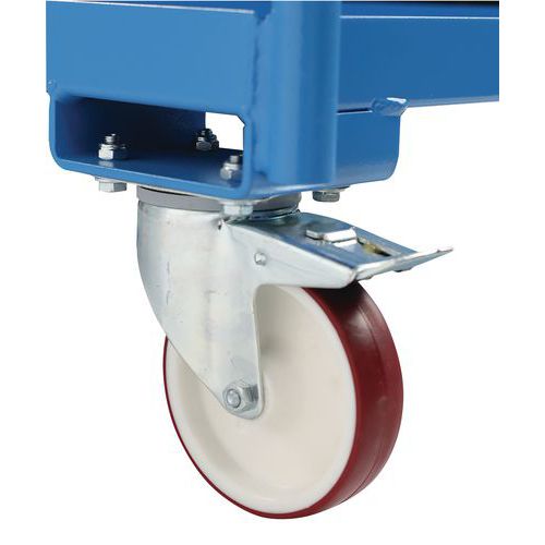Manipulation facile grâce à ses 2 roues fixes et 2 roues pivotantes à frein.