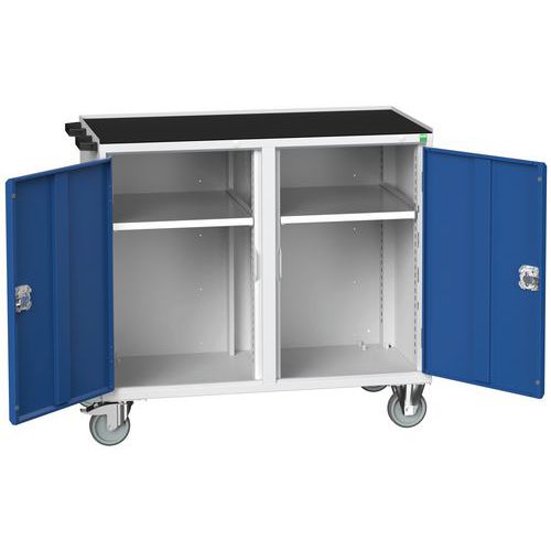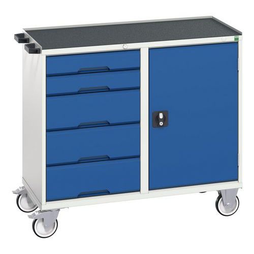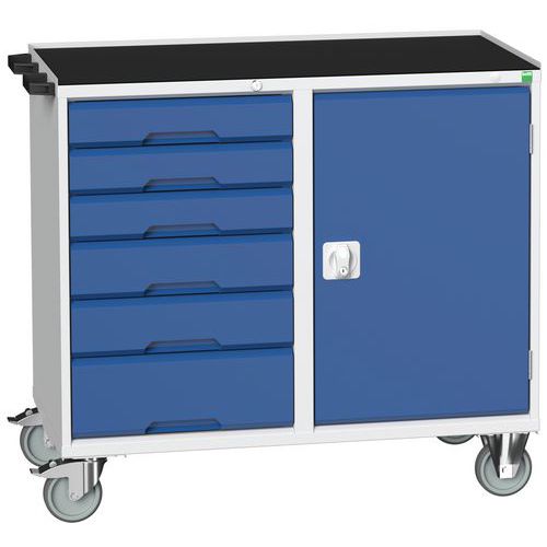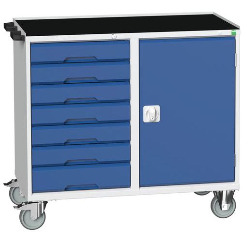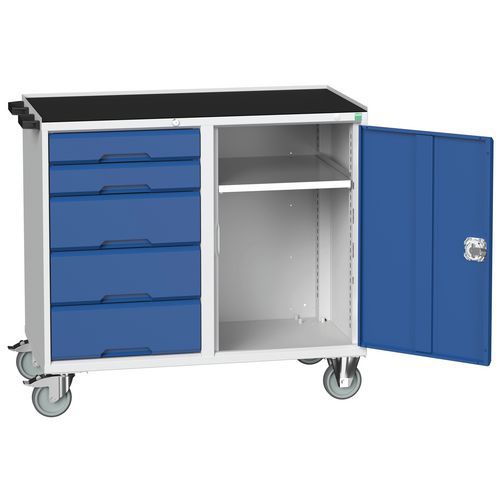 Construction en tôle d’acier soudé Le compartiment à porte est équipé d’une tablette en acier galvanisé réglable en hauteur Charge par tablette 60 Kg Ouverture des tiroirs à 100%, charge 50 Kg Mécanisme de sécurité empêchant l’ouverture accidentelle des tiroirs Poignée de manutention 4 roulettes diamètre 125mm, 2 fixes et 2 pivotantes à frein Charge maximum admissible 200 Kg Largeur 1050 mm Hauteur 980 mm, profondeur 600 mm avec plateau épaisseur 30 mm Hauteur 965 mm, profondeur 550 mm avec dessus 3 rebords Fabriqué au RU Charge maxi (kg) : 300