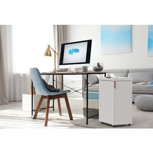 Destructeur de document avec système de protection et de sécurité P-4. Smiley lumineux indiquant la capacité maximale du destructeur, évite les bourrages. Bloc de coupe en acier spécial, robuste et sûr acceptant Carte bleu, CD et trombone. Marche/arrêt automatique par cellule. Meuble bois avec porte, monté sur roulettes. Réceptacle pratique avec poignée de préhension. Idéal pour le télétravail