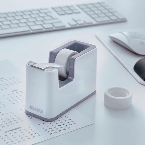 Dévidoir avec un rouleau d'adhésif bicolore à la finition glossy Compatible avec les rouleaux adhésifs jusqu'à 19 mm de largeur et 33 mm de long Rouleaux adhésifs facilement et rapidement interchangeables Patins antidérapants n'abîmant pas le mobilier et assurant une parfaite stabilité Base lourde et lame ultra-aiguisée pour une découpe facile d'une seule main