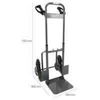 - Diable acier polyvalent avec tablier incurvé et bavette fixe de 405 x 238 mm, capacité de charge 250 kg.