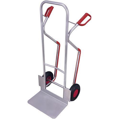 Diable en aluminium avec grande pelle, très léger et maniable Construction mécano-soudée en tube d'aluminium. 2 poignées de sécurité en plastique. Roues à bandage pneumatique sur jantes en tôle d'acier ou roues à bandage caoutchouc plein sur jantes en plastique spéciale. Capacité de charge 200 kg.