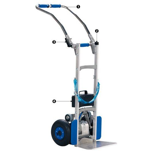 | Intitulé du produit | Diable motorisé pour escaliers, Force: 170 kg, Roue bandage: Pneumatique, Type de bavette: Pliante |