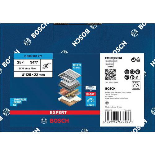 Disque Expert N477 SCM - Bosch Jusqu'à 4 fois plus rapides qu'un disque standard. Abrasion maximale avec Bosch Surface Structure. Se met simplement en place par fixation auto-agrippante. Idéal pour affiner les surfaces métalliques, par exemple après le meulage d'une soudure, pour affiner les surfaces métalliques avant la peinture ou pour éliminer des défauts, de la rouille ou une décoloration. Idéal pour les métalliers : rapide et efficace.