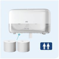 - Distributeur de papier toilette Tork à deux rouleaux facile à recharger.