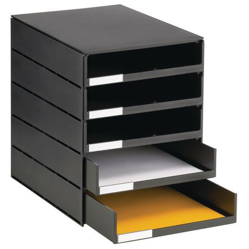Module de classement 5 tiroirs Styroval pro éco durable aux dimensions externes étroites (243 mm de largeur). Convient pour les armoirs et les étagères. Disponible avec des tiroirs coulissant ouverts ou bien fermés, pour le classement jusqu’au format C4. Styroval pro éco est un système de classement qui présente des dimensions extérieures minimes par rapport au volume intérieur des tiroirs. Il utilise au mieux l’espace disponible Styroval se relève indispensable partout où la place est comptée.