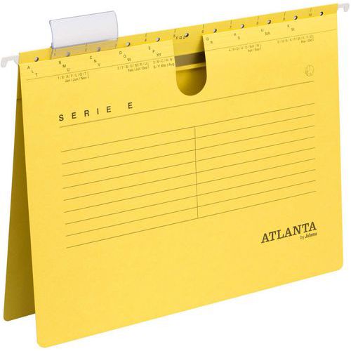 Dossiers suspendus résistants, durables et universels avec reliure Fastener, pour tout type d’utilisation. Pour format A4, avec zone d’identification imprimée en noir. Compatibles avec les porte-étiquettes transparents Vario 60 mm. Crochets de suspension métalliques, avec extrémités en revêtement pulvérisé blanc. Reliure en métal de 80 mm avec compresseur en métal. En papier cartonné recyclé 230 g/m². Principalement utilisé en Allemagne.