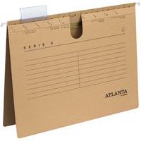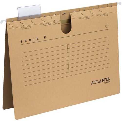 Dossiers suspendus résistants, durables et universels avec reliure Fastener, pour tout type d’utilisation. Pour format A4, avec zone d’identification imprimée en noir. Compatibles avec les porte-étiquettes transparents Vario 60 mm. Crochets de suspension métalliques, avec extrémités en revêtement pulvérisé blanc. Reliure en métal de 80 mm avec compresseur en métal. En papier cartonné recyclé 230 g/m². Principalement utilisé en Allemagne.