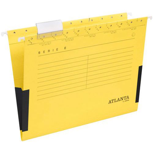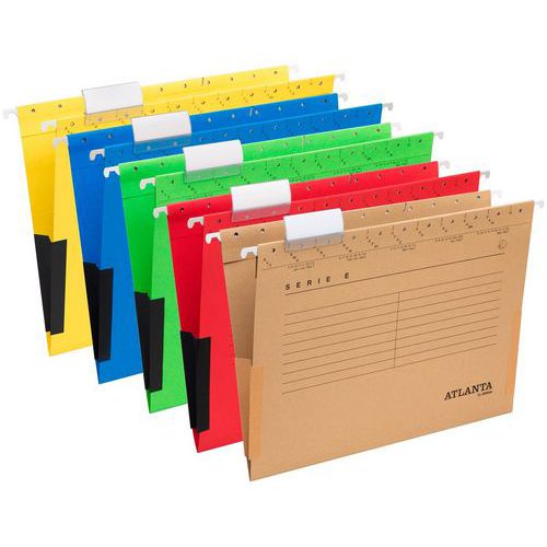 Dossiers suspendus résistants, durables et universels pour tout type d’utilisation. Pour format A4, avec zone d’identification imprimée en noir et soufflets en toile de lin beige. Compatibles avec les porte-étiquettes transparents Vario 60 mm. En papier cartonné recyclé 230 g/m². Principalement utilisé en Allemagne.