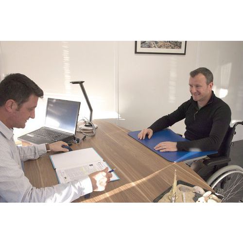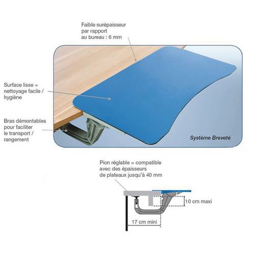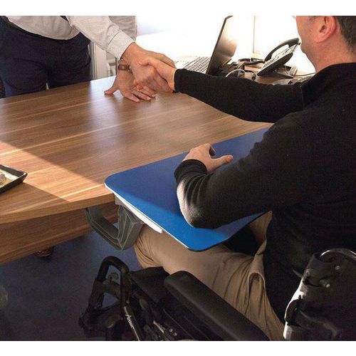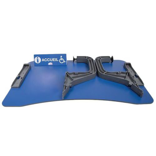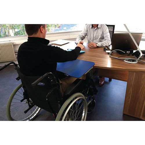 Aménagement pour comptoir ou bureau. Tablette amovible permettant la réception d'une personne en fauteuil roulant. Conforme à la législation PMR. Cette tablette permettra, sans coût excessif, de mettre aux normes votre comptoir. Permet à un PMR d'écrire grâce à un vide laissant passer ses jambes.