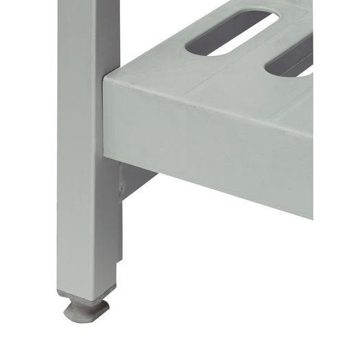 Échelle avec pieds réglables pour nivellement parfait au sol. Terminaison haute des échelles avec capuchon PVC. Structure tube carré matériau aluminium anodisé. Nivellement au sol : ± 20 mm. Section : 25 x 25 mm.