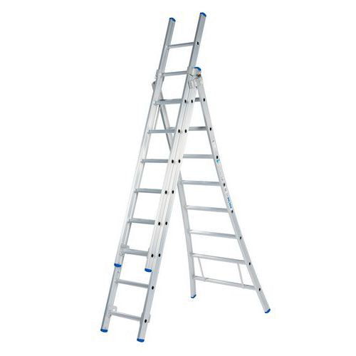 Polyvalence maximale : L’échelle 3 plans transformable type reform peut être utilisée en position coulissante, auto-stable (en A), ou appuyée, ce qui la rend idéale pour de multiples applications professionnelles.