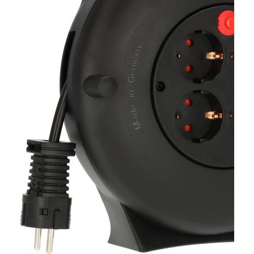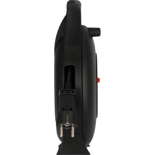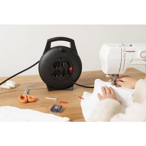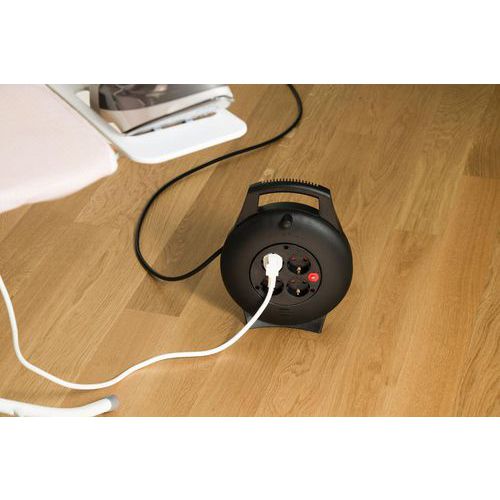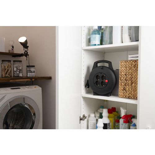 Enrouleur de câble d'intérieur avec poignée de transport ergonomique et bonne stabilité grâce à la grande baseLe boîtier au design épuré est résistant aux chocs et fabriqué en plastique spécial.