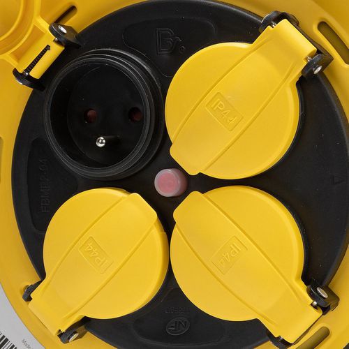 - Enrouleur professionnel IP44 (2P+T) avec poignée ergonomique et pratique pour gants de travail.
