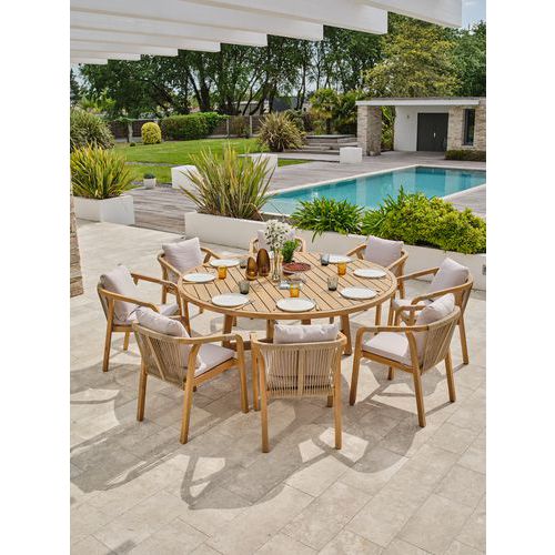 - Accompagné de 8 fauteuils avec structure en bois d’acacia et assise en corde tissée pour un confort optimal.