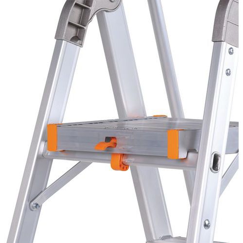 Escabeau professionnel aluminium. Tablette porte-outils multifonction. Confortable et sûr avec rampe. Profils renforcés aluminium. Système de vérouillage de la plateforme. Marches antidérapantes. Facile à transporter, à ranger.