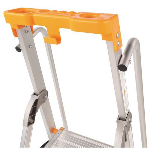 Escabeau professionnel aluminium. Tablette porte-outils multifonction. Confortable et sûr avec rampe. Profils renforcés aluminium. Système de vérouillage de la plateforme. Marches antidérapantes. Facile à transporter, à ranger.
