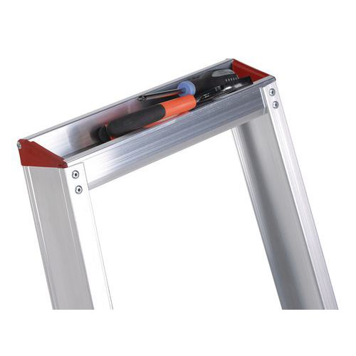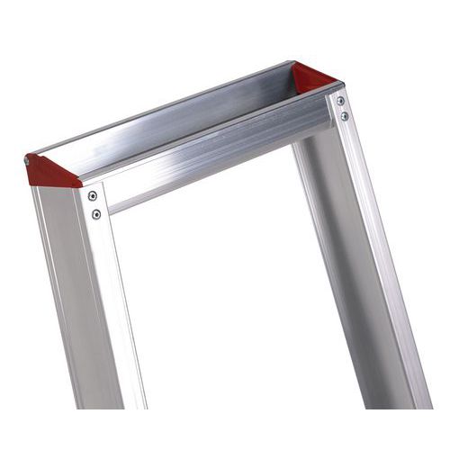 Escabeau professionnel simple accès en aluminium extrêmement léger avec des marches à profil creux. Les marches sont fixées à l’aide de rivets tubulaires. Ainsi, elles peuvent être remplacées rapidement en cas de besoin. Repliez et dépliez l'escabeau de manière rapide et aisée grâce au système de charnière auto-verrouillant sur la plate-forme.