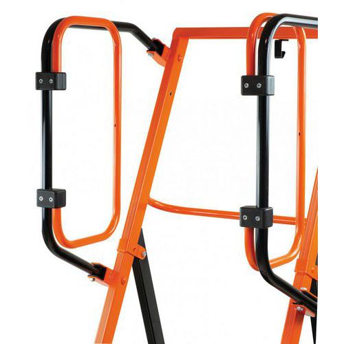 Roues bombées sur ressort. Tube arrière surélevé. Faible encombrement. Garde corps à battants. Robuste et facile à déplacer. Dimesnions du porte-outils : Longueur 450mm, Largeur 80 mm, Hauteur 25mm.