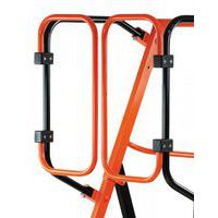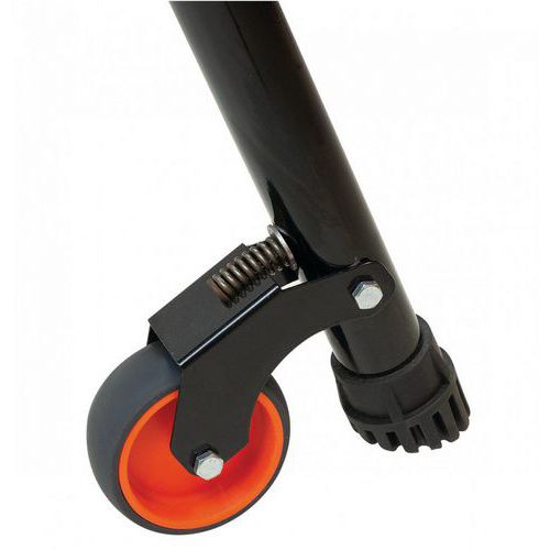Roues bombées sur ressort. Tube arrière surélevé. Faible encombrement. Garde corps à battants. Robuste et facile à déplacer. Dimesnions du porte-outils : Longueur 450mm, Largeur 80 mm, Hauteur 25mm.