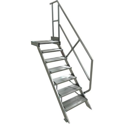 Escalier avec plate-forme à inclinaison à 1 main courante. Structure profils aluminium et pièces de jonction en acier traité. Plateforme haute avec garde-corps 1 côté, sous-lisses et plinthes. Marches fixées aux montants par visserie, montées sur cadre, anti-rotation. Marches en profilé d'aluminium strié antidérapant non corrosif, durable. Fixation de l'escalier par des équerres sur chacune des extrémités. Produit fabriqué en France.
