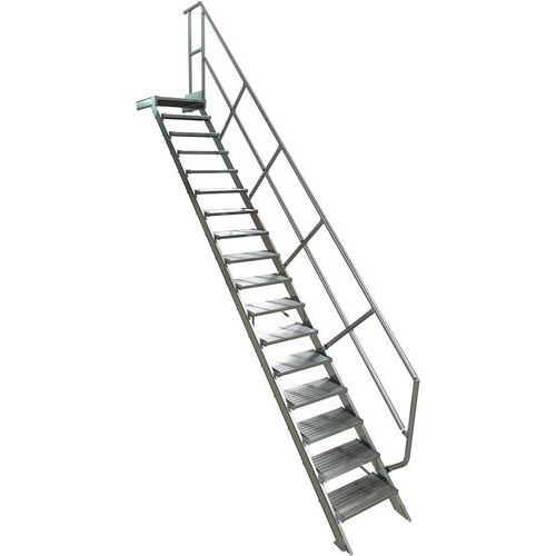 Escalier avec plate-forme à inclinaison à 1 main courante. Structure profils aluminium et pièces de jonction en acier traité. Plateforme haute avec garde-corps 1 côté, sous-lisses et plinthes. Marches fixées aux montants par visserie, montées sur cadre, anti-rotation. Marches en profilé d'aluminium strié antidérapant non corrosif, durable. Fixation de l'escalier par des équerres sur chacune des extrémités. Produit fabriqué en France.